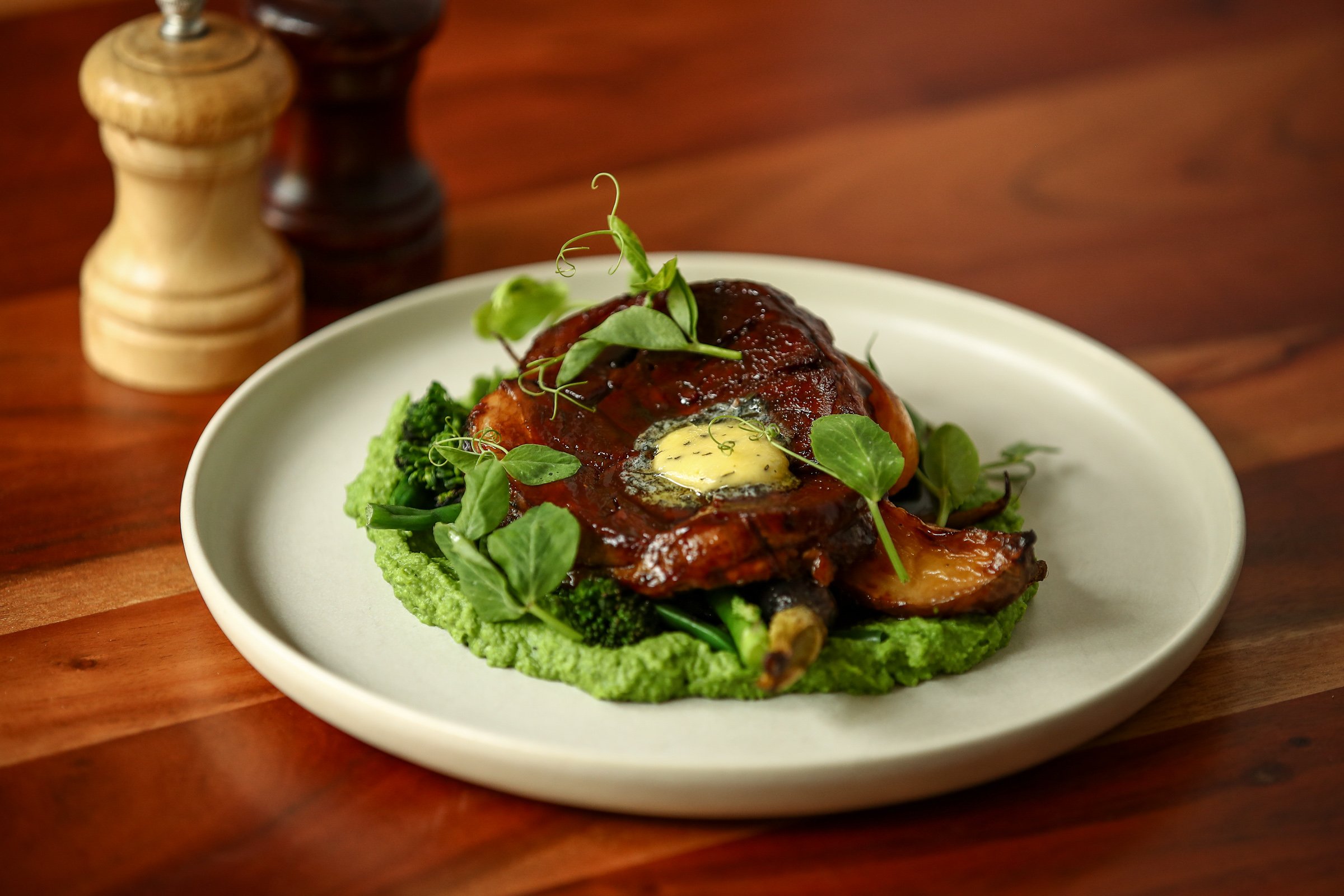 Tender lamb shoulder with fondant root vegetables, charred greens and a pea puree with mint and rosemary butter
