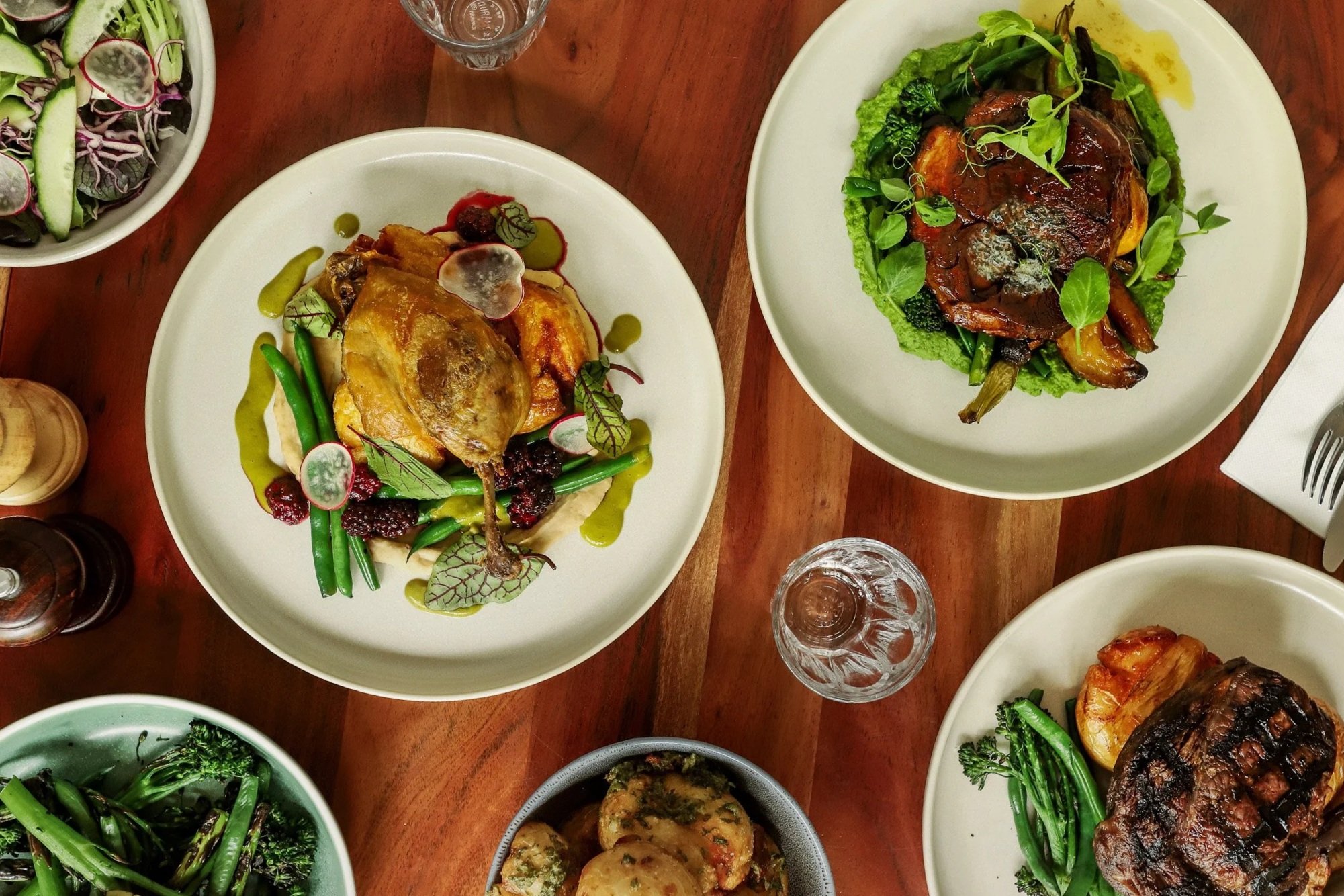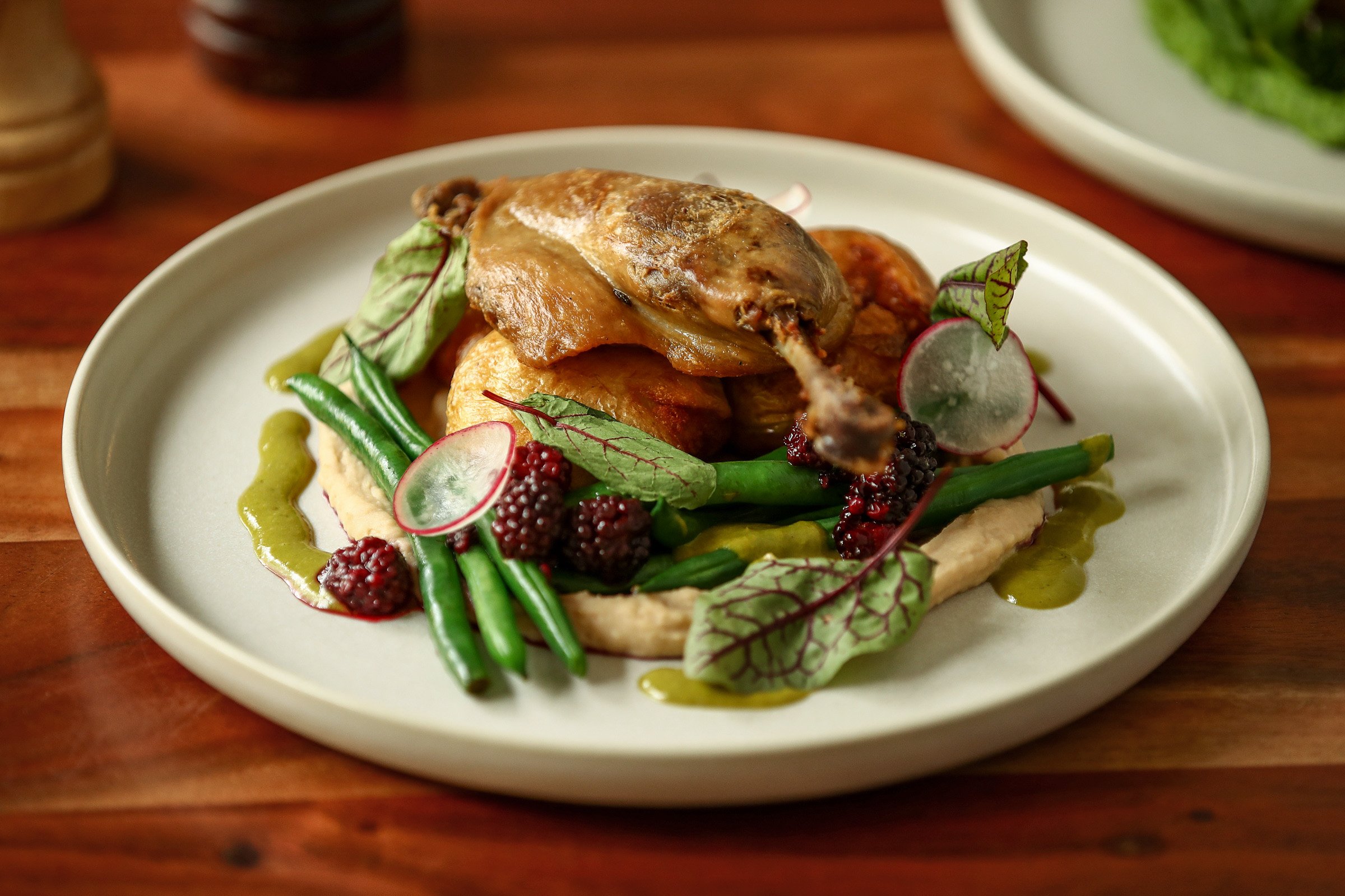 Served with green beans, crispy chat potatoes, white bean skordalia, tarragon and fresh local blackberries