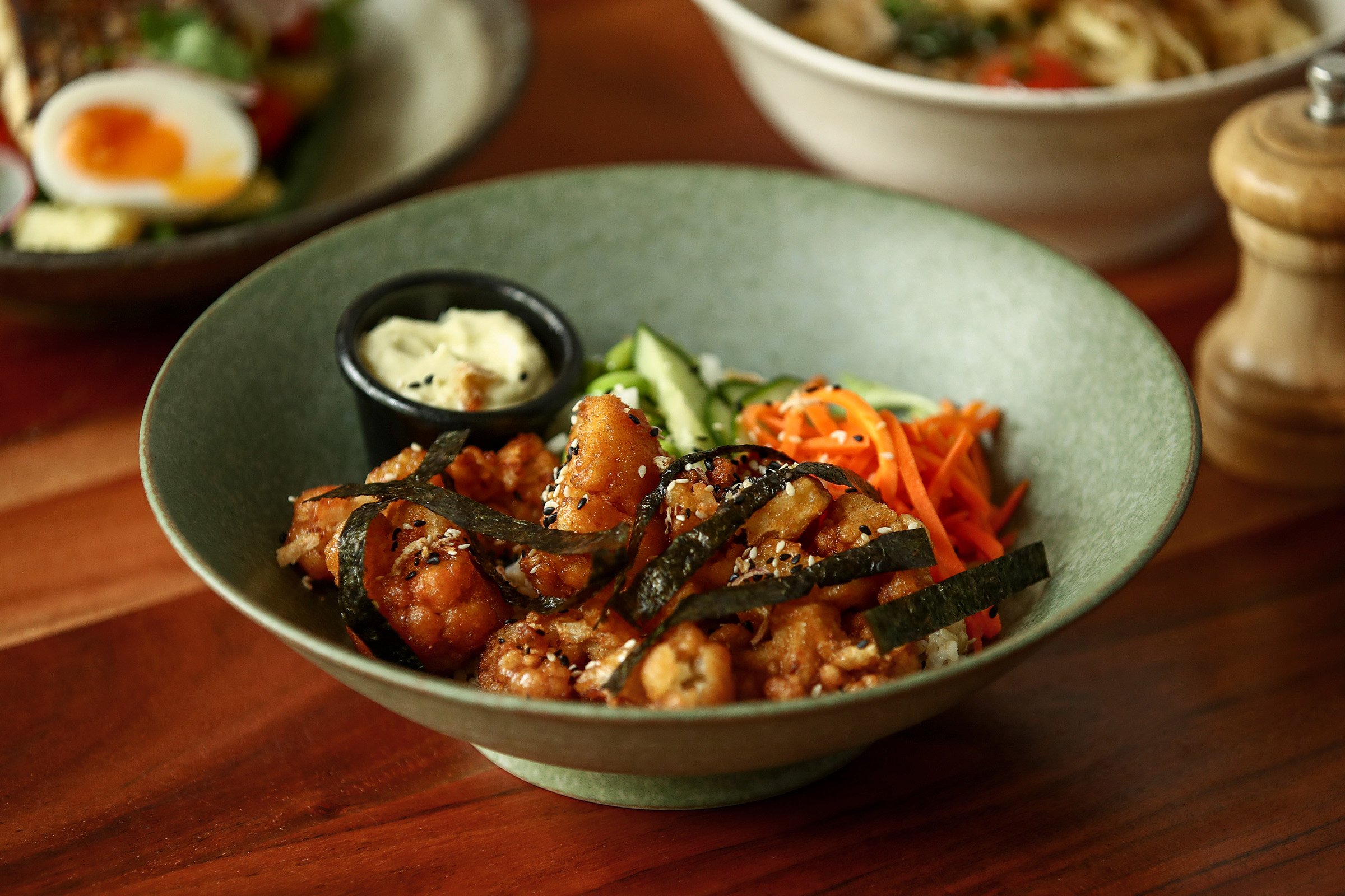 Crispy fried miso and maple glazed cauliflower with brown rice, cabbage, mixed leaves, edamame, cucumber, pickled daikon and carrot with house made wasabi aioli