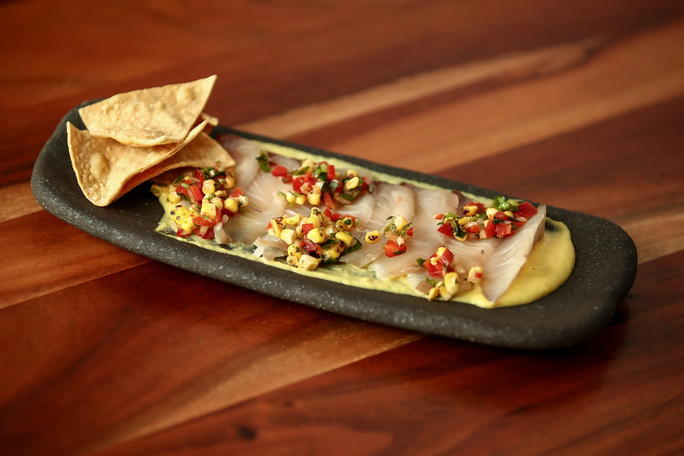 Served with charred corn, lime, corn puree, shallot, coriander salsa and tortillas