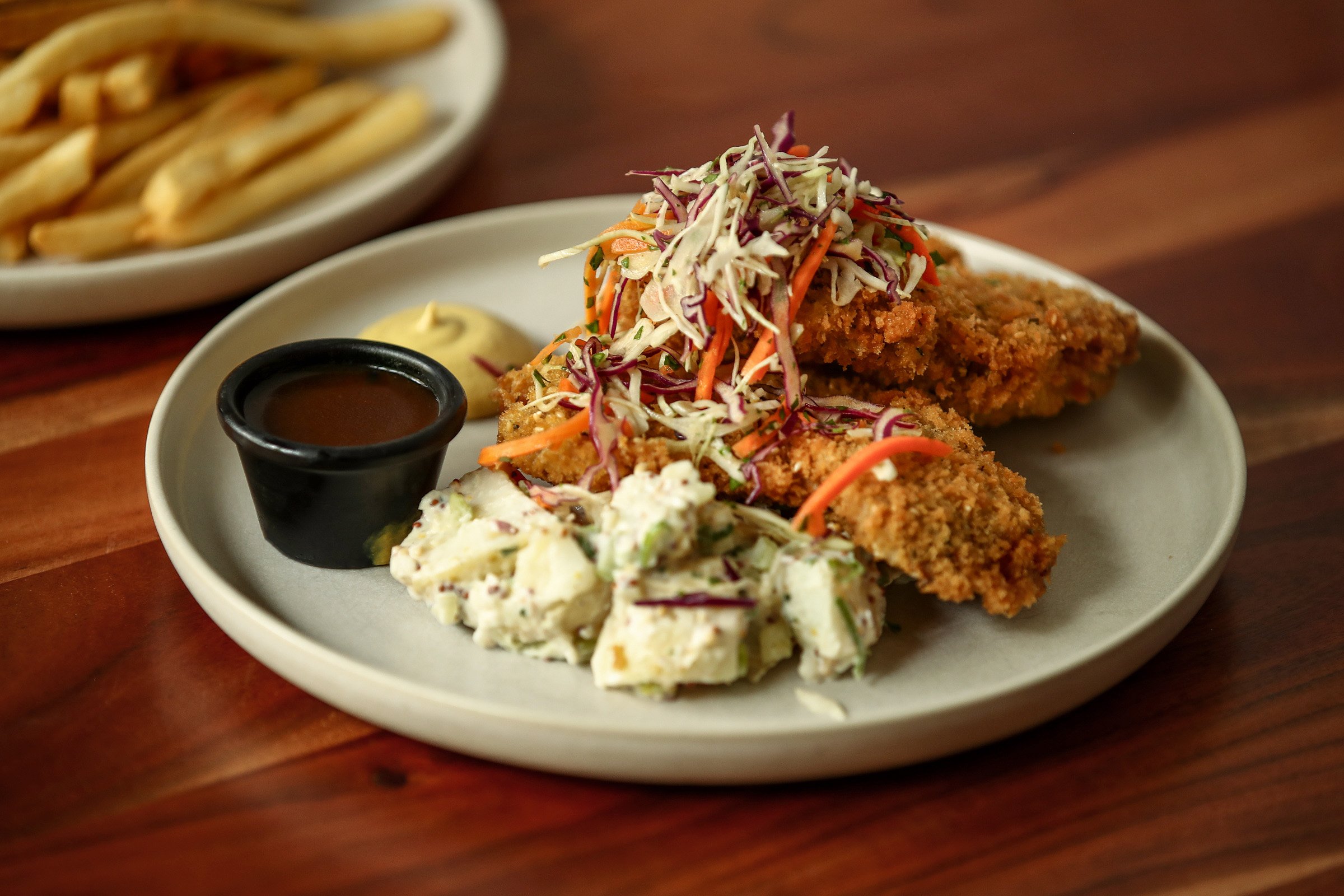 Crumbed beef rump schnitzel with slaw, potato salad, mustard and gravy