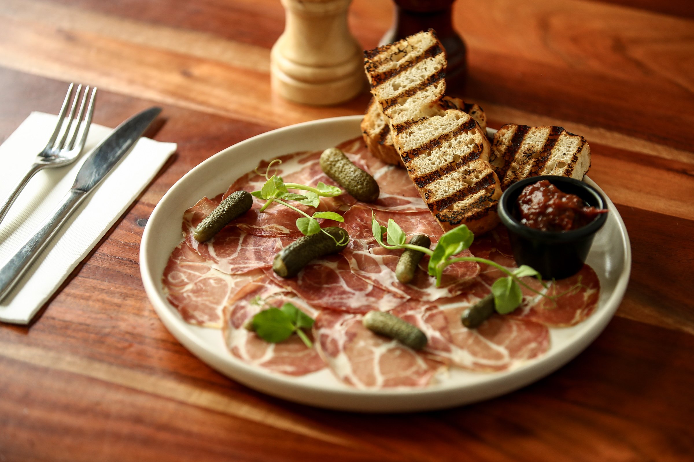 Thinly sliced cured pork salumi served with house made toasted focaccia and tomato relish