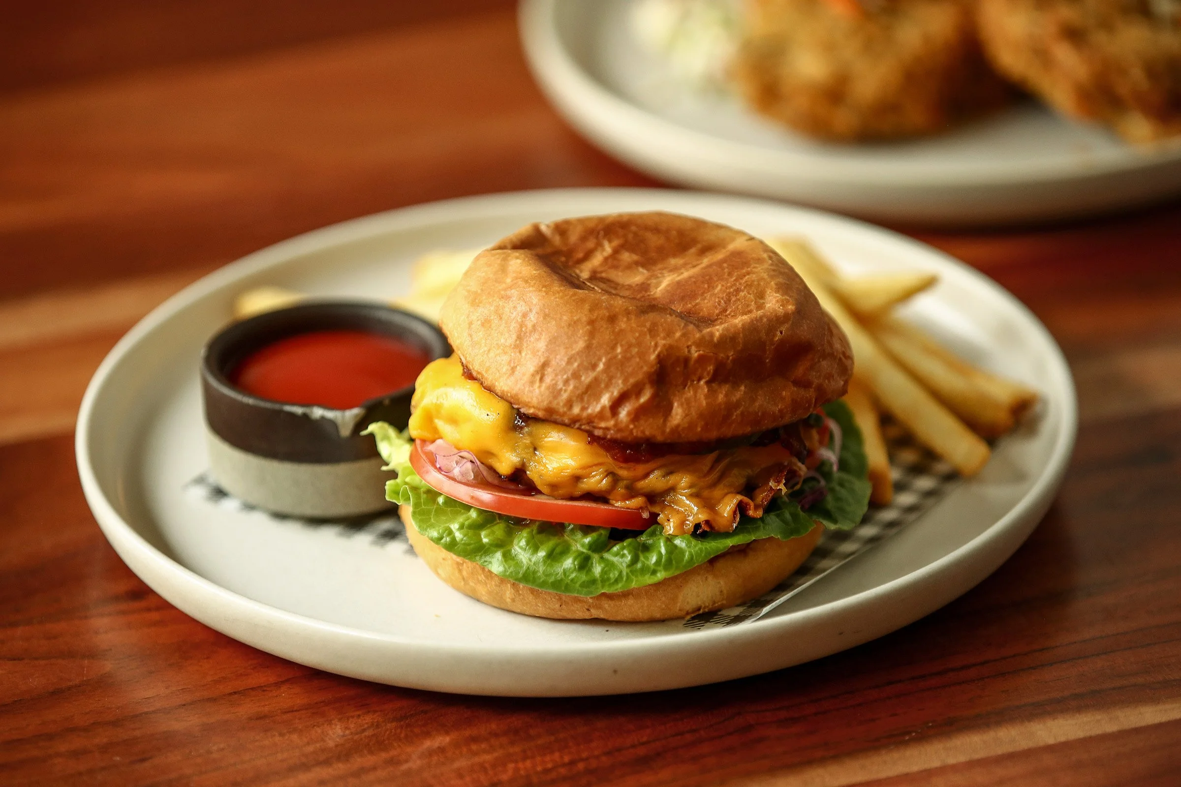 Juicy beef patty, bacon, lettuce, tomato, red onion, American cheese, pickles and house made BBQ sauce served with chips