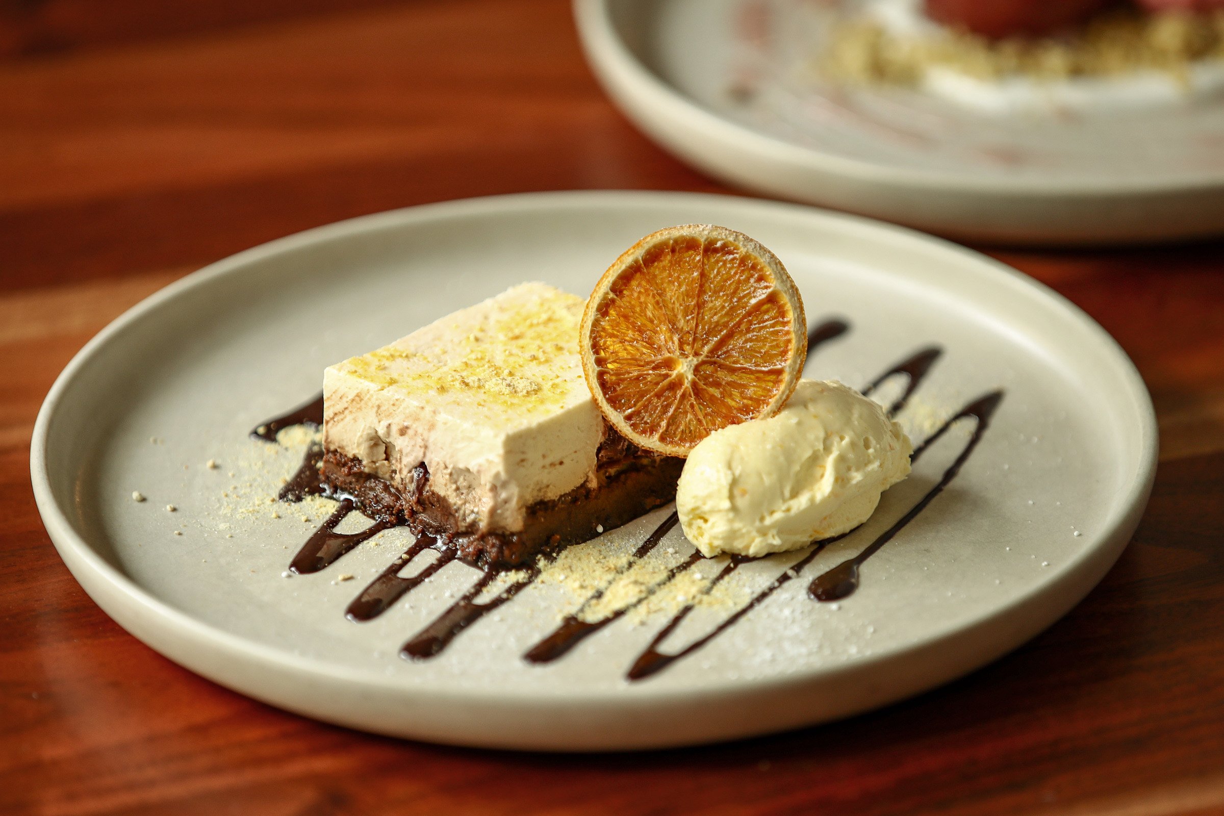 With orange mascarpone, chocolate sauce and dried orange