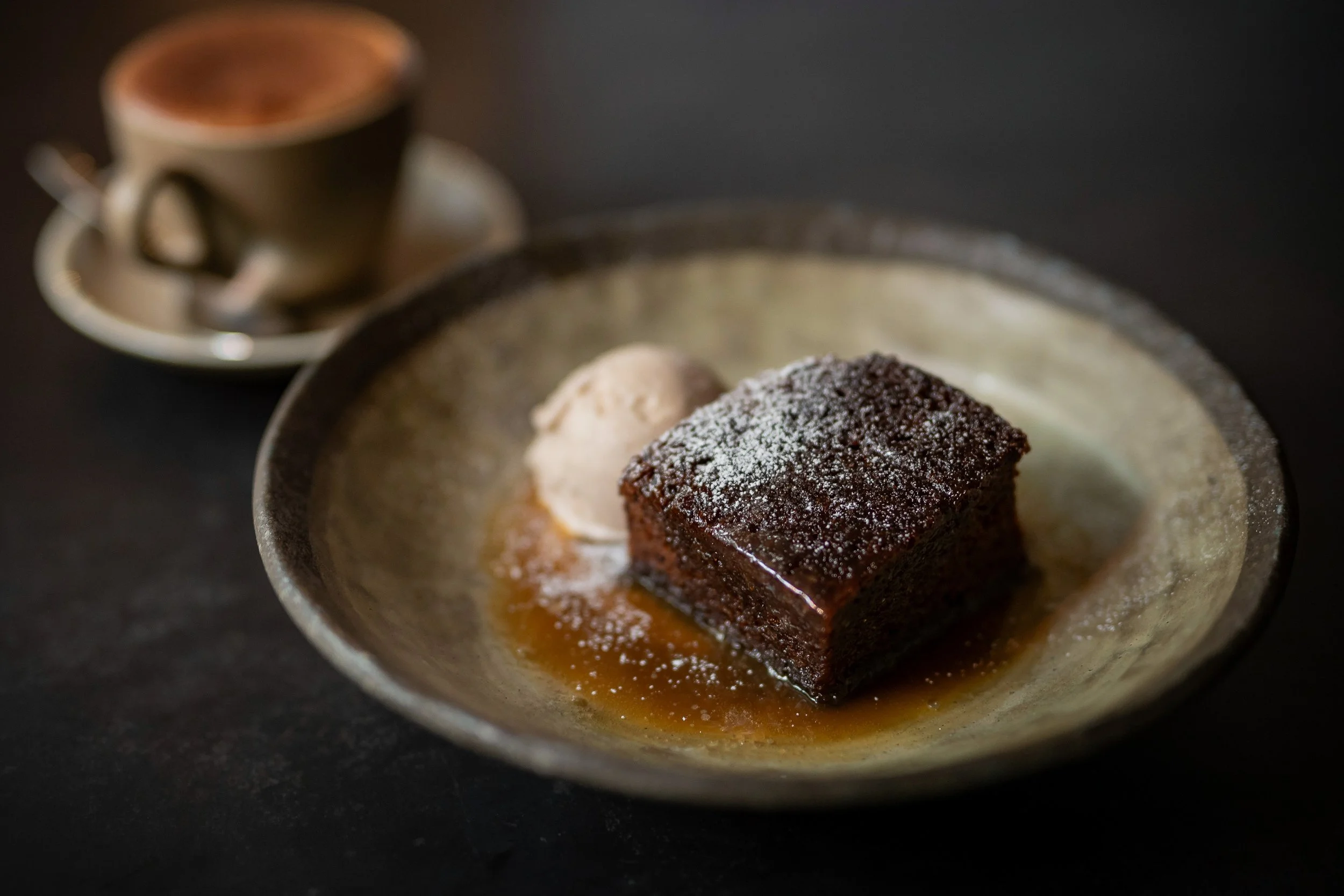 Warm sticky date pudding with caramel sauce and vanilla bean ice cream