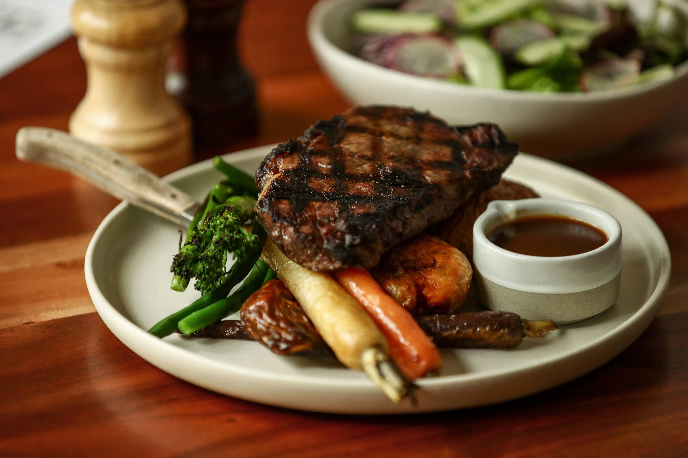 Premium 300g porterhouse steak, served with crispy chat potatoes, charred vegetables and your choice of sauce